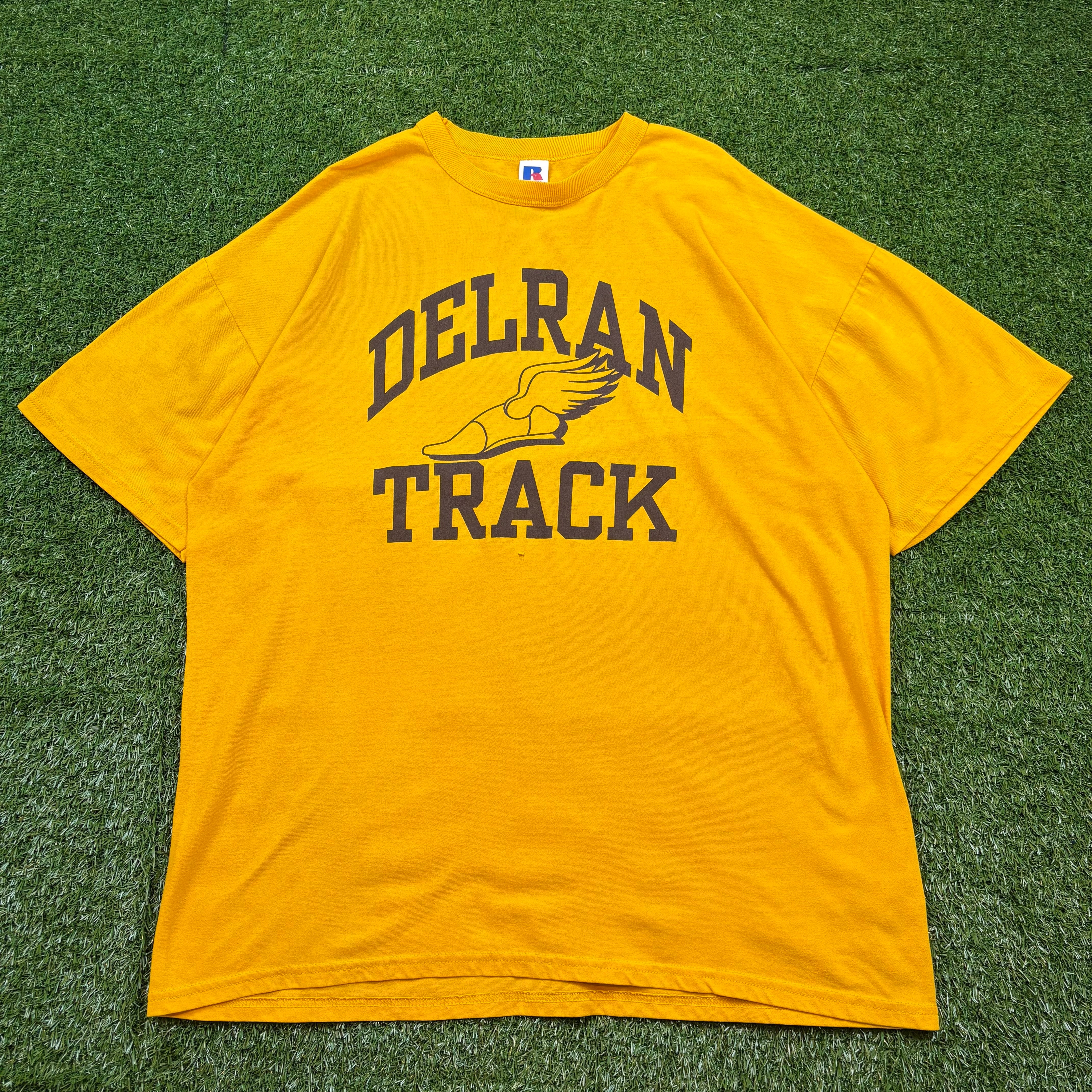 90s VINTAGE RUSSELL ATHLETIC 陸上チーム ウイングフット DELRAN TRACK プリント 半袖 T-sh Tシャツ サイズ メンズ XL 90年代 ビンテージ ヴィンテージ ストリート アメカジ 古着 b26032057