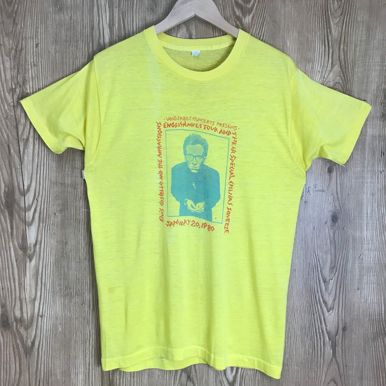 USA製 80s VINTAGE ELVIS COSTELLO AND THE ATTRACTIONS ロックT バンドT 染み込みプリント 半袖 T-sh Tシャツ サイズ メンズ S位 シングルステッチ 80年代 アメリカ製 エルビスコステロ ビンテージ ヴィンテージ ストリート アメカジ 古着 s24070704