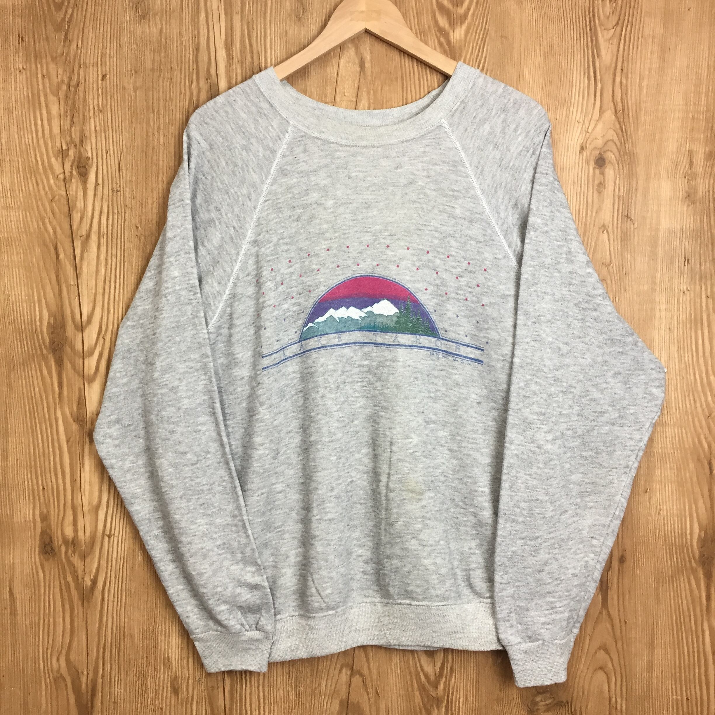 USA製 90s 霜降りグレー LAKE TAHOE スーベニア プリント スウェット スエット トレーナー サイズ メンズ L 90年代 アメリカ製 VINTAGE ビンテージ ヴィンテージ ストリート アメカジ 古着 s24102831【WS30】【スウェットシャツ】